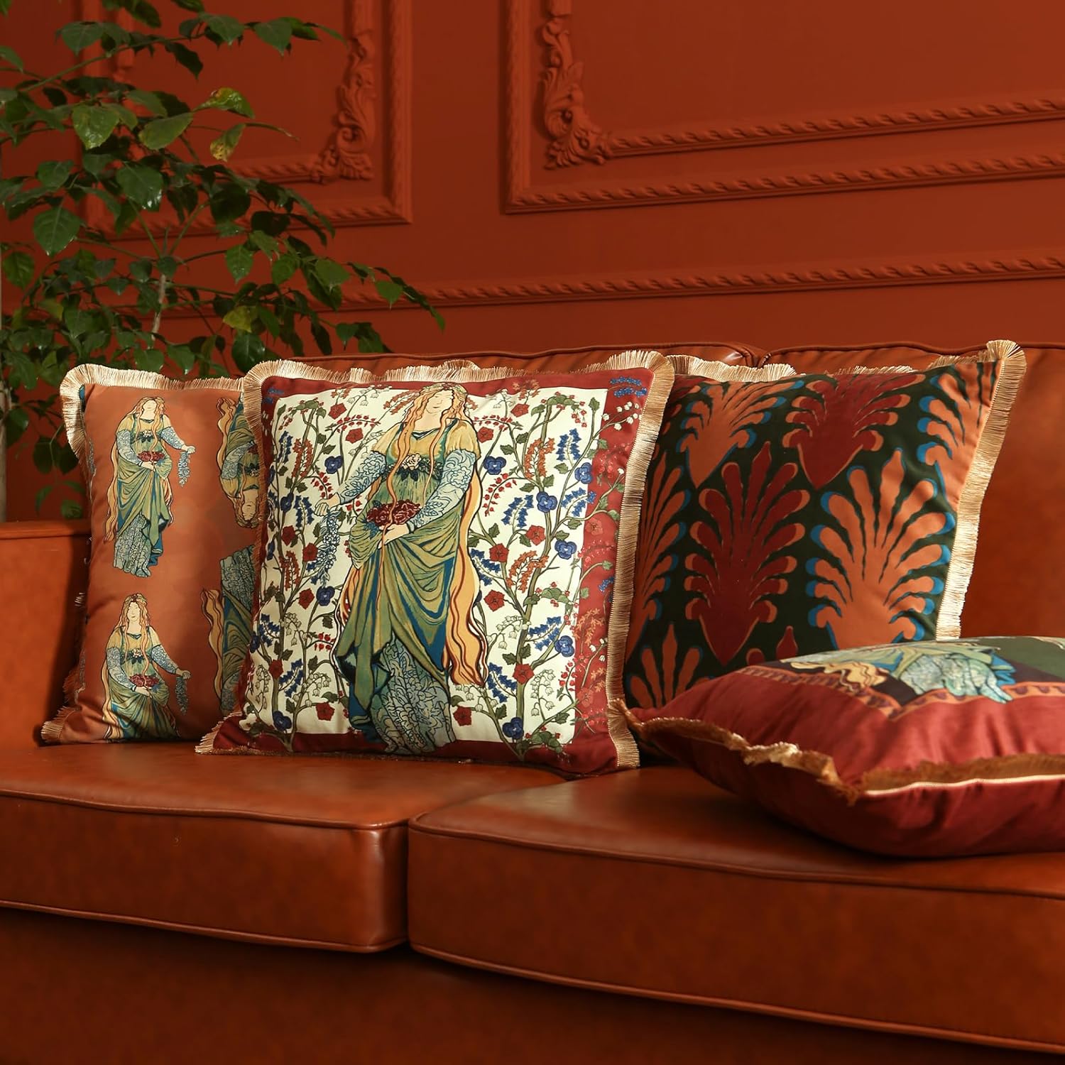 Every great room needs a touch of drama—and these vintage-inspired velvet throw pillows deliver just that with a whisper of Renaissance romance. With their rich jewel-toned palettes, classical motifs, and luxurious fringe trim, these pillows aren’t just accessories—they’re storytelling elements. Think: a curated salon in an old English manor or a grand European drawing room layered in culture, art, and history.
